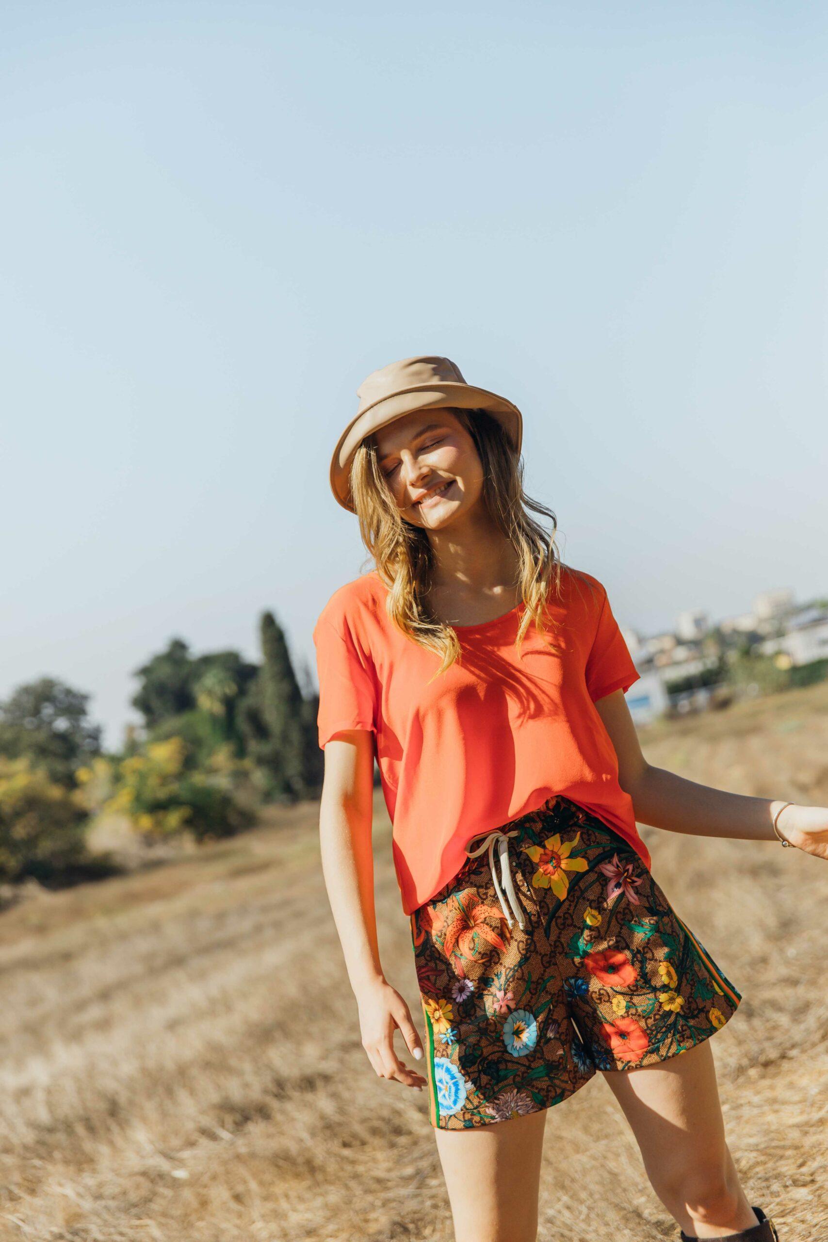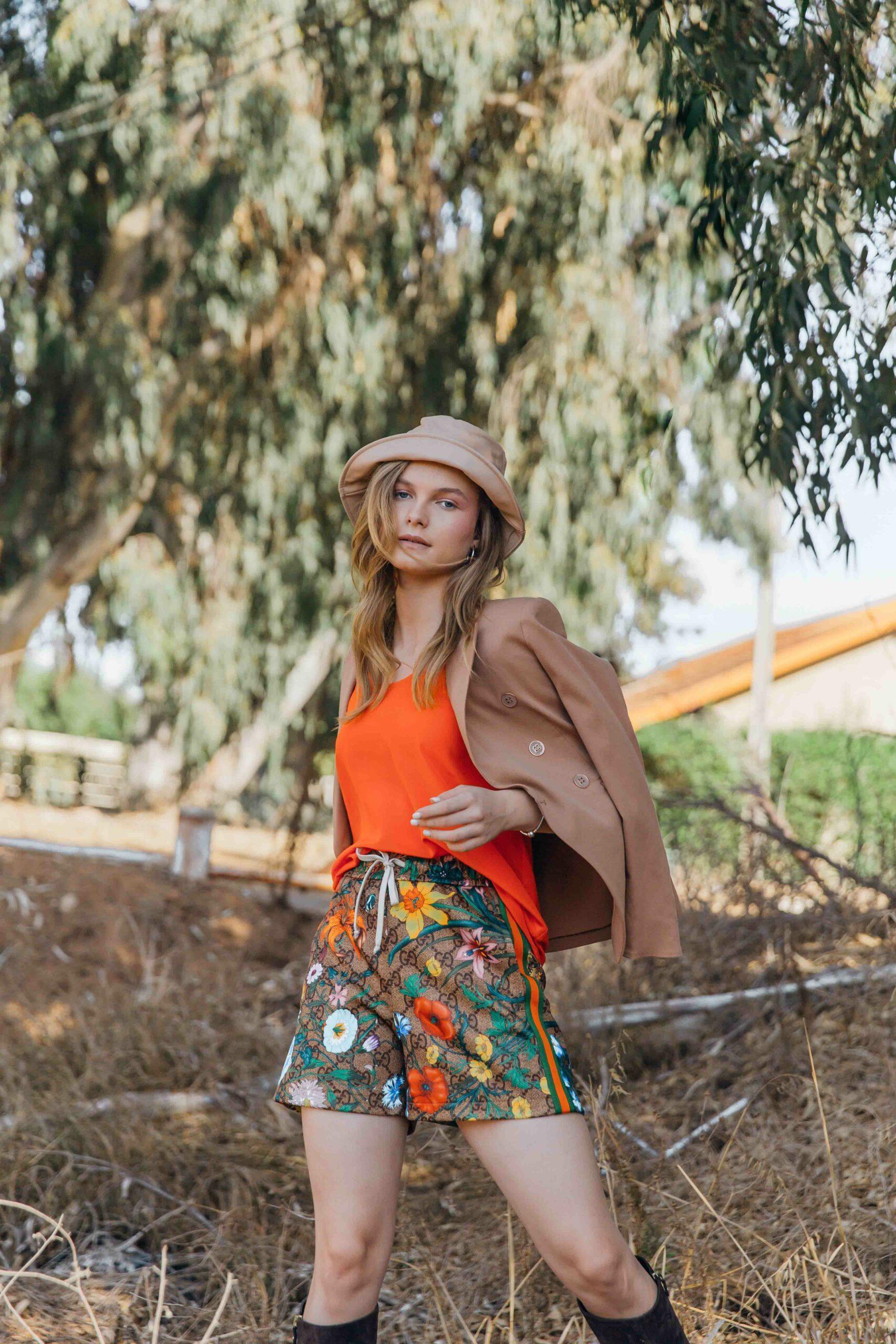 מכנסי גוצ'י פרחים בצבעים יפים, הדפס לוגו של גוצ'י, מותניים אלסטיות