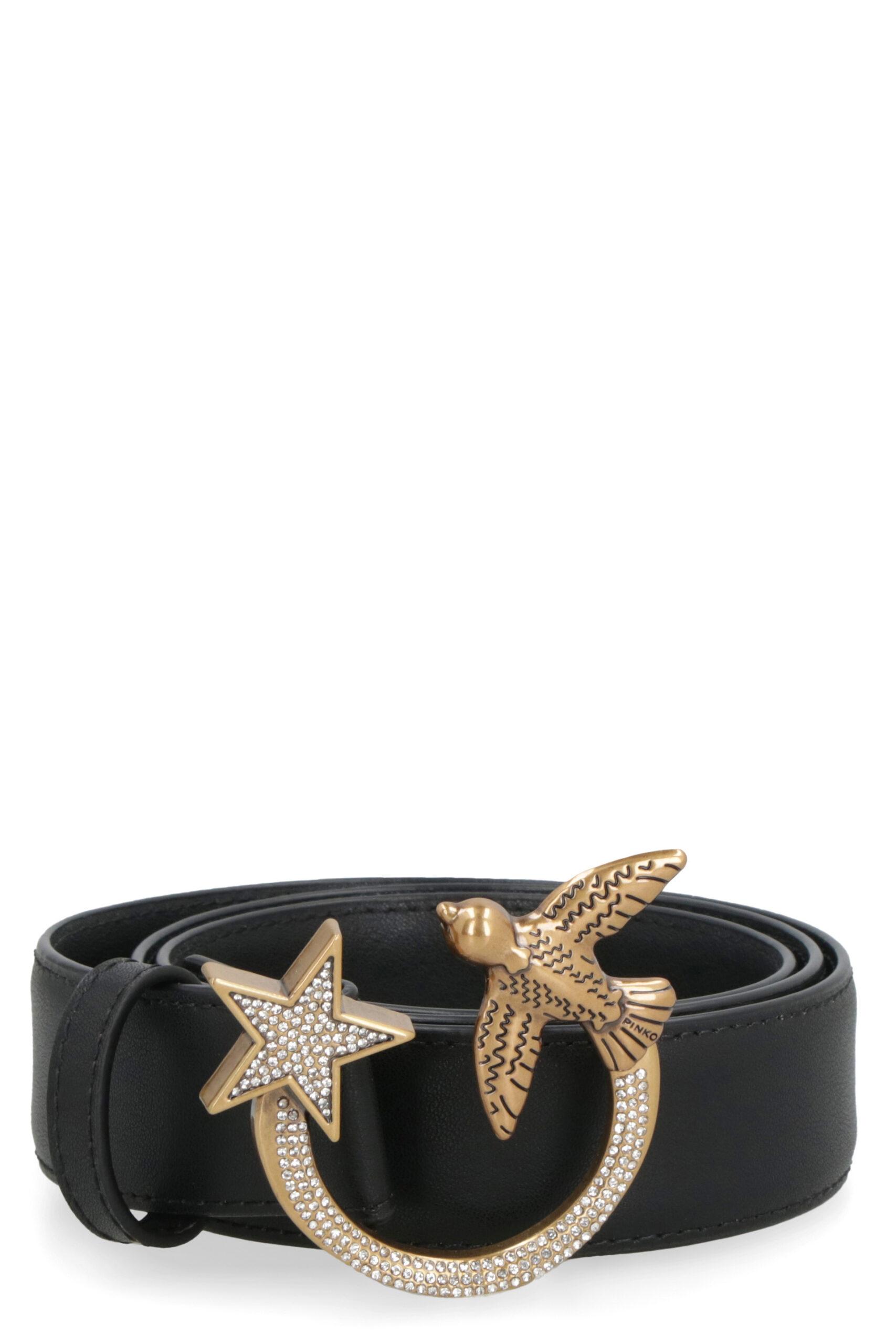 חגורת עור עם אבזם לוגו מבית PINKO הכוללת שחור, עור, פרט אבזם דקורטיבי, חומרה בגוון זהב, חורים מחוררים והתאמה מתכווננת.