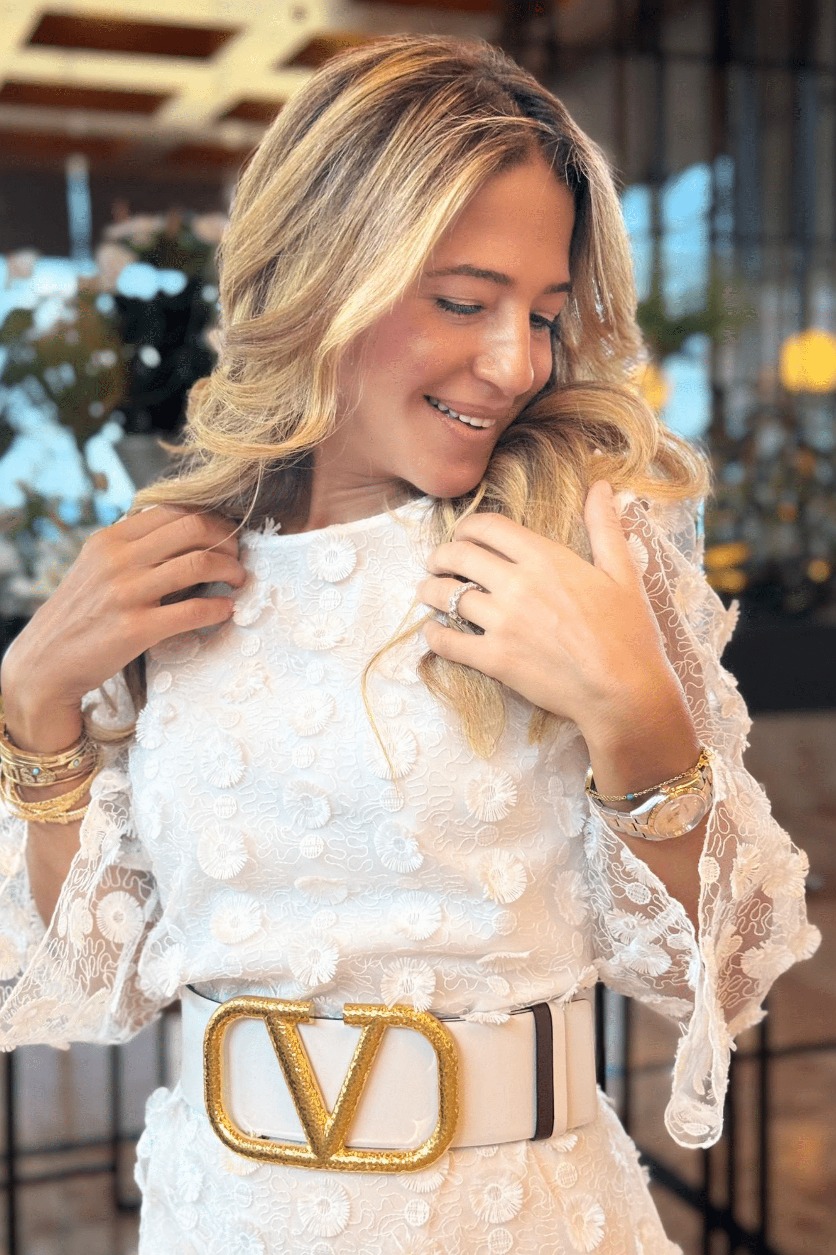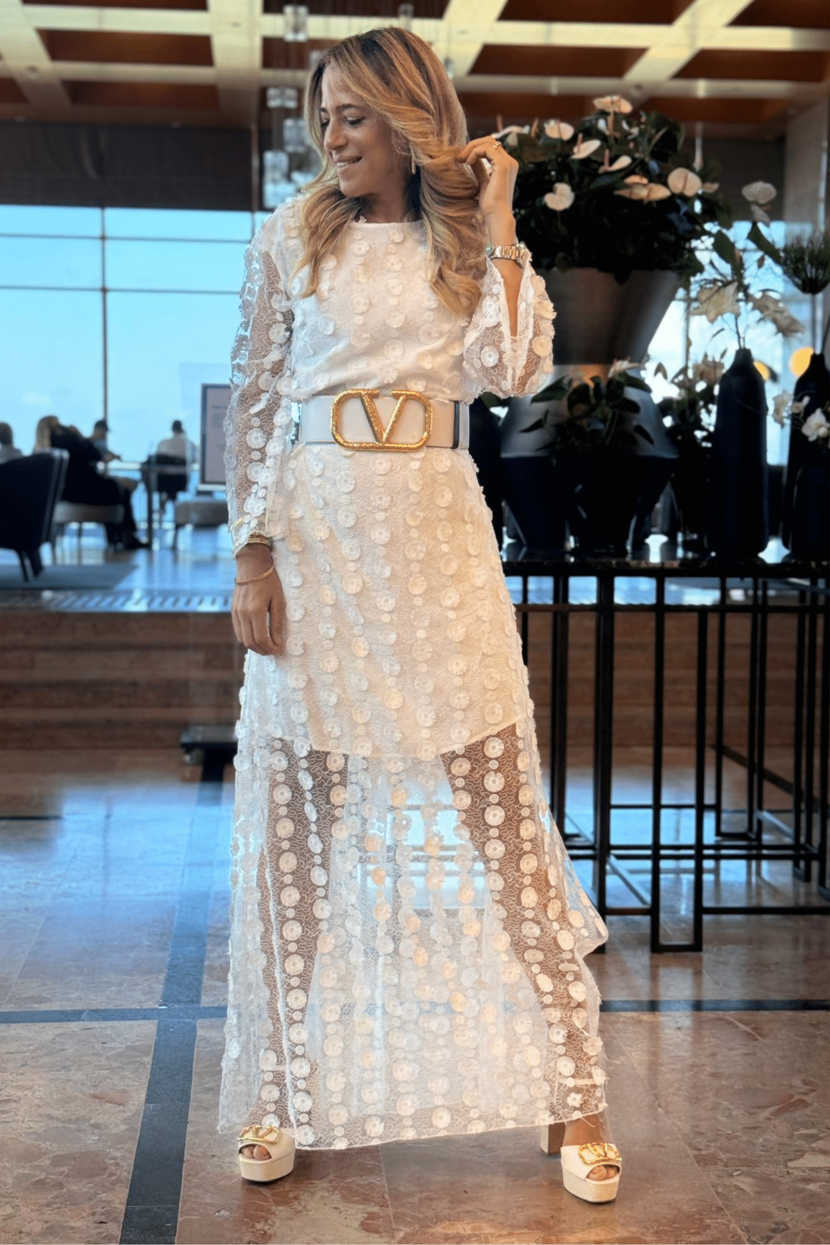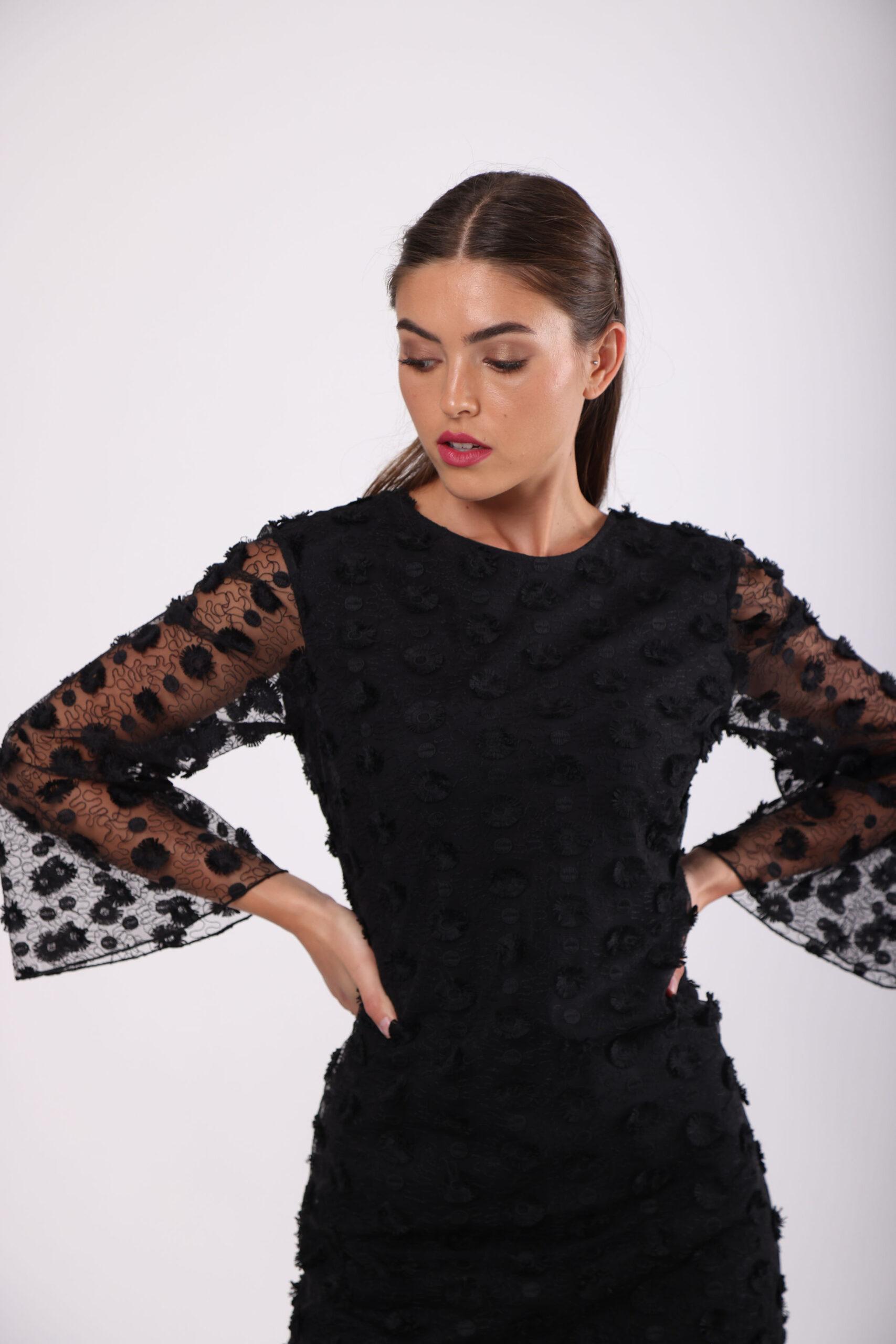 Black open back maxi dress, with over the knee lining. Applique flower net, bat three-quarter sleeves